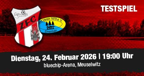 1. Männer | Testspiel ZFC TESTET GEGEN VFC PLAUEN (18.02.26 10:03 Uhr) Heute Abend findet ein kurzfristig anberaumtes Testspiel der 1. Männermannschaft gegen den Oberligisten VFC Plauen statt. Gespielt wird auf dem Kunstrasenplatz der bluechip-Arena. Anstoß ist 18:30 Uhr. |